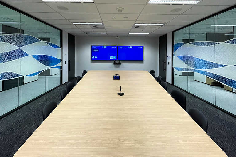 To cater for the medium formal meeting spaces, expected to host between 8-12p, the all-in-one Poly Studio X50 with a TC8 touch panel was the selected solutions. Similar to the X30, the key point of differentiation for this solution is the integration of a stereo speaker instead of mono, and extended audio pickup range to 7.6m.