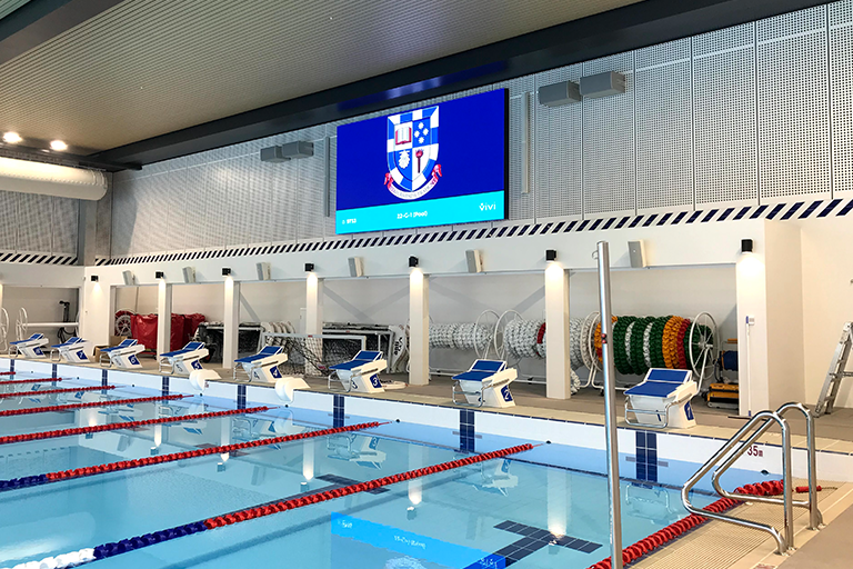 Featuring a heated 8-lane 50m pool, this facility was designed to mirror that of a professional swimming setting. In addition to swim meets, the pool is to be used for several activities including water polo, water fitness, lifesaving training and swimming lessons. For this reason, a range of different audio visual features were integrated into the space.