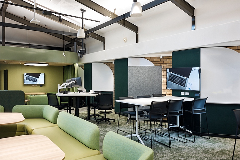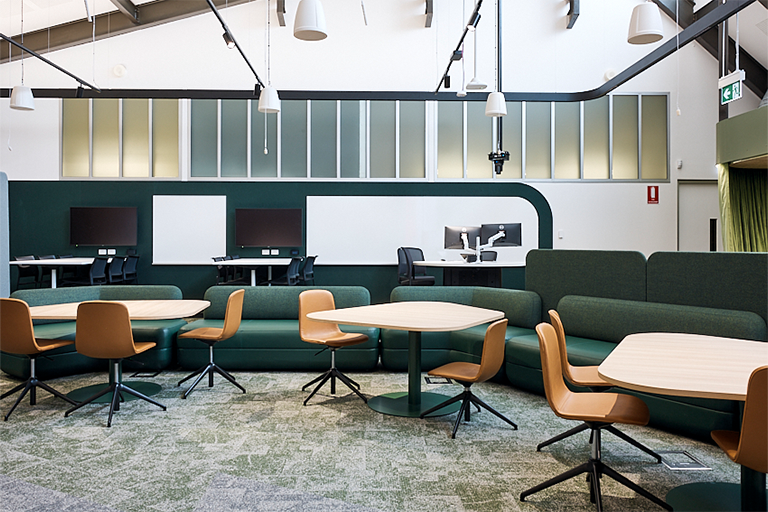 Achieved through the combining of two existing spaces, Room 310 & 311, this refurbishment has allowed for a specialised multi-purpose space with a system that supports three key pedagogical modes: Launchpad for mini-lectures, Huddle for independent quadrant-based seminars, and Focus for smaller group work and collaboration.