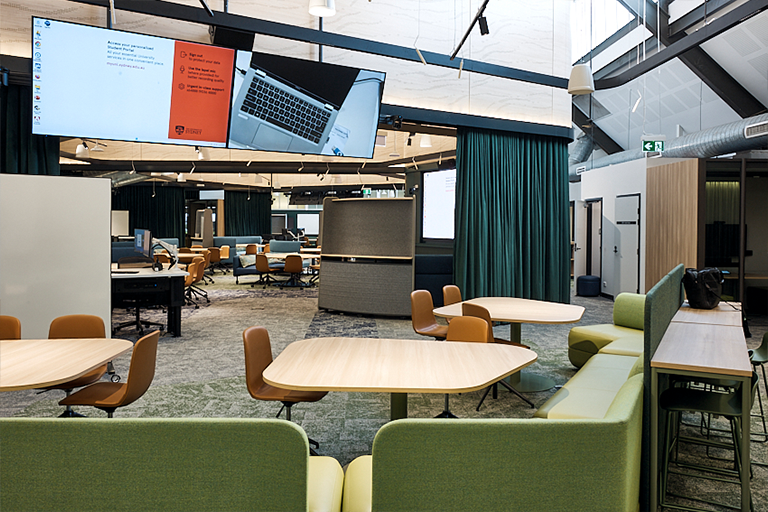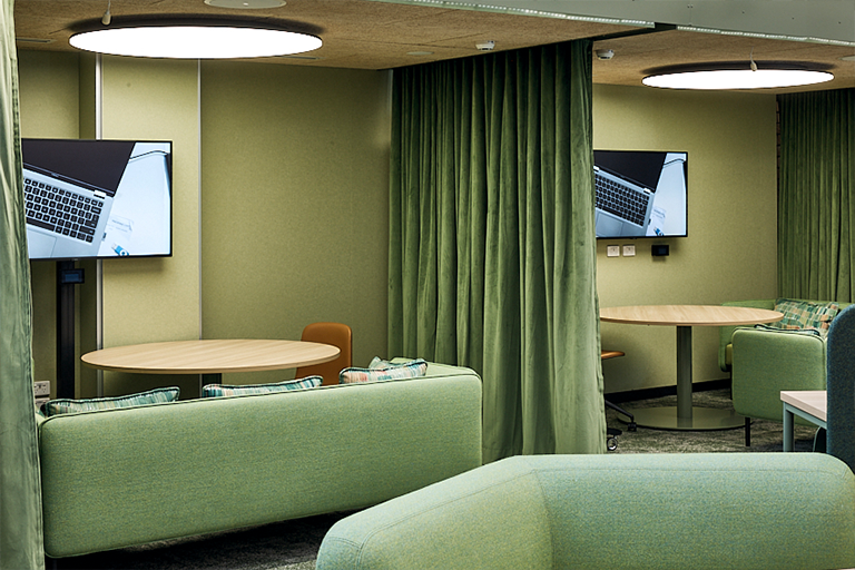 Small enclosed pods, effectively small glass windowed rooms were also developed inside the space for small group collaboration. Within each of these enclosed pods, a networked microphone and loudspeaker were integrated.