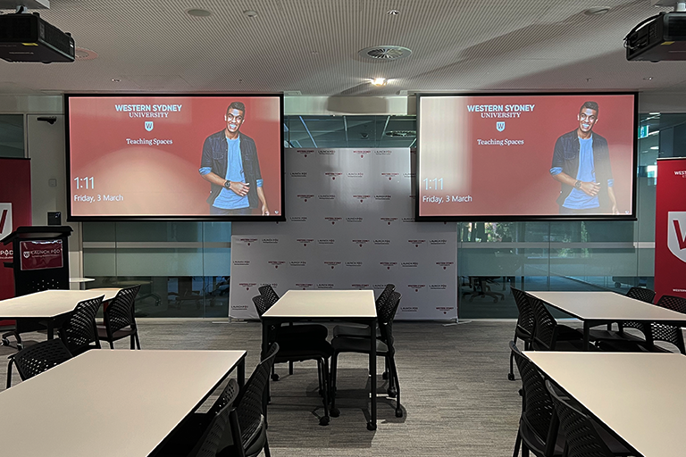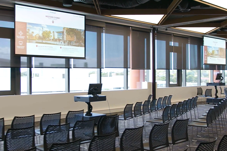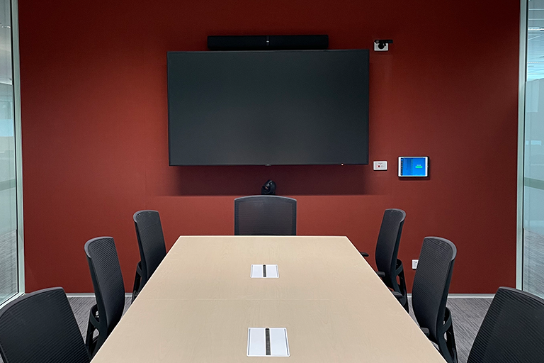 Room booking panels are essential tool used by WSU to provide students and staff with real time information about room availability and upcoming events. Over 160 Crestron wall-mounted 10’’ TSS-1070 panels were installed across the two sites at the entry door to spaces, allowing users to easily reserve available spaces.