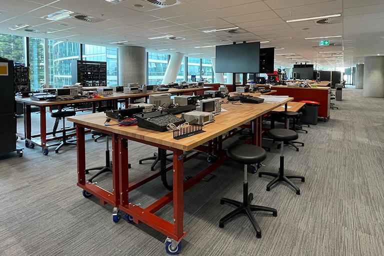 The Factory of the Future Presentation space is a high impact area for presentations and video conferencing in an informal open space. It is essentially a digital signage installation centred around a curved 6×4 1.2mm pixel pitch Samsung LED video wall for maximum impact. Content can be displayed via a digital signage media player, or when in presentation mode, users have the option of BYOD connectivity through a HDMI port. A Mac Mini is also included to be used as the dedicated computer to control and run zoom for video conferencing enablement in the space. Complete with the same PTZ camera, and Sennheiser wireless microphone set up of the conference room and tiered theatre, this open space zone is a standout of the project.